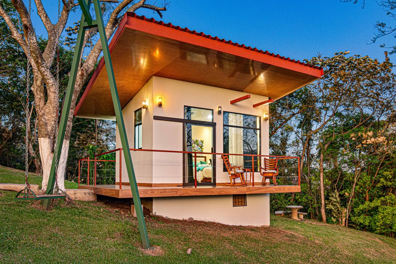 The tiny house which we call the honeymoon suite can sleep 2 people. It has its own kitchen and a large jetted tub. The outside of the house opens up to an amazing view and had a massive swing set for two.