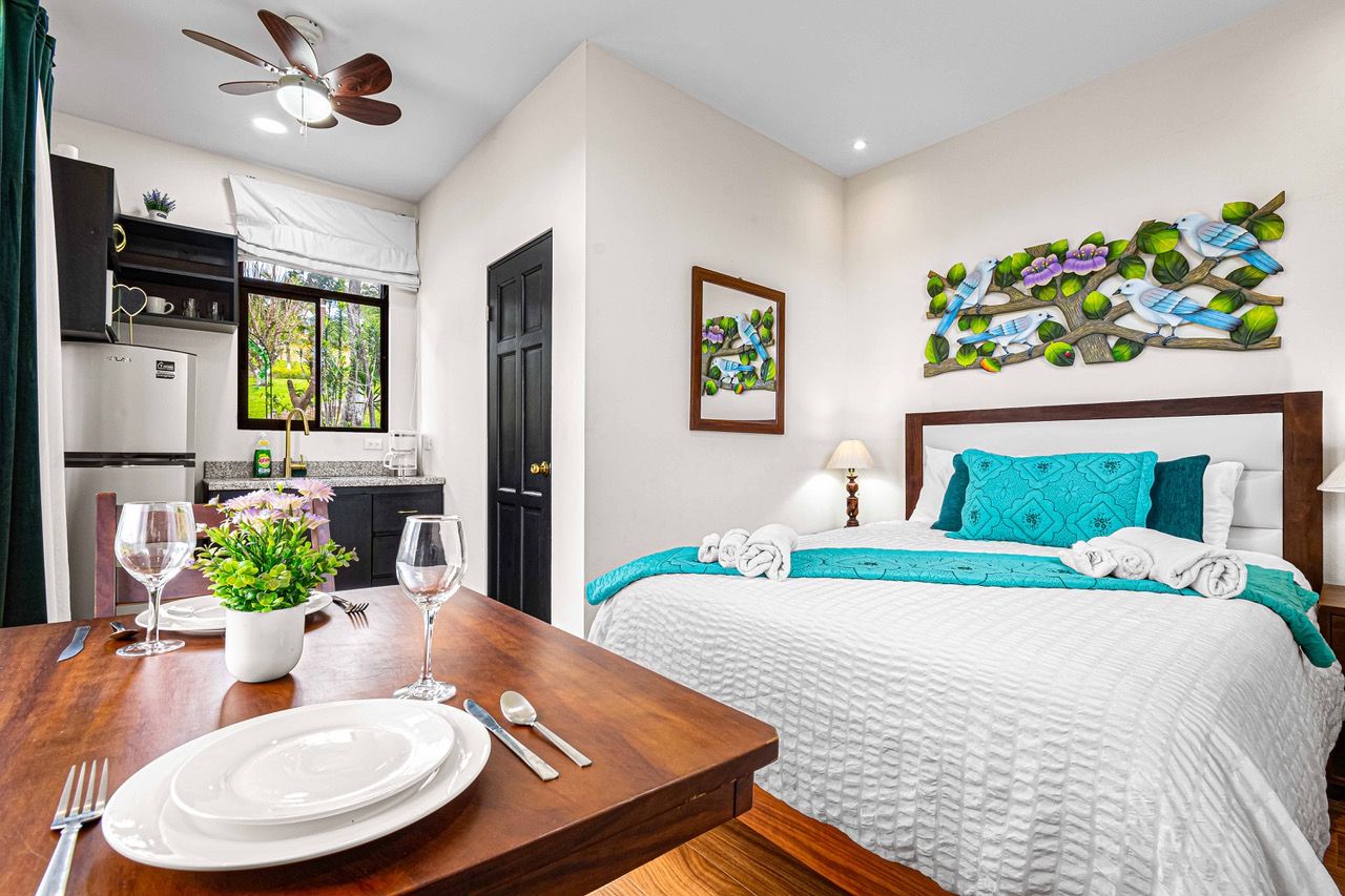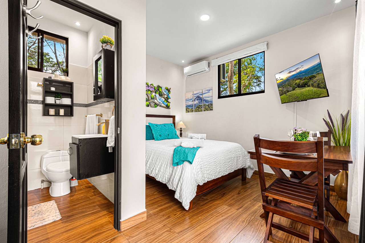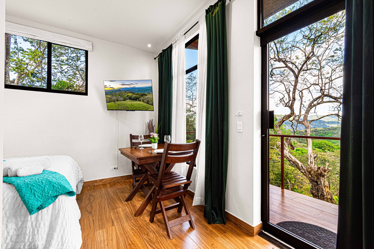 Enjoy amenities such as the refreshing infinity pool, outdoor hammocks, outdoor eating area with BBQ grill, extensive grounds surrounded by a private gated entrance, dedicated work spaces with the highest speed internet that Costa Rica has to offer and a private gym on the property. And during your stay please take a moment to try our fresh tropical fruit off of our many fruit trees, and take in the amazing views of the sunrise and sunset from your private balcony.